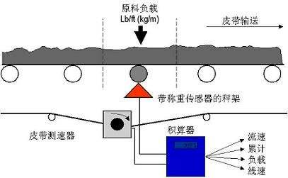 電子皮帶秤由稱重裝置、稱重傳感器、測(cè)速傳感器和稱重顯示器組合而成。電子皮帶秤稱重時(shí),稱重裝置將皮帶上物料的重力傳遞到稱重傳感器上,稱重傳感器的輸出與物料重力的電壓信號(hào)形成正比,而經(jīng)過放大器放大后送模/數(shù)轉(zhuǎn)換器變成數(shù)字量A,送到運(yùn)算器;物料速度輸入速度傳感器后,速度傳感器即輸出脈沖數(shù)B,也送到運(yùn)算器;運(yùn)算器對(duì)A、B進(jìn)行運(yùn)算后,即得到這一測(cè)量周期的物料量。對(duì)每一測(cè)量周期進(jìn)行累計(jì),即可得到皮帶上連續(xù)通過的物料總量。